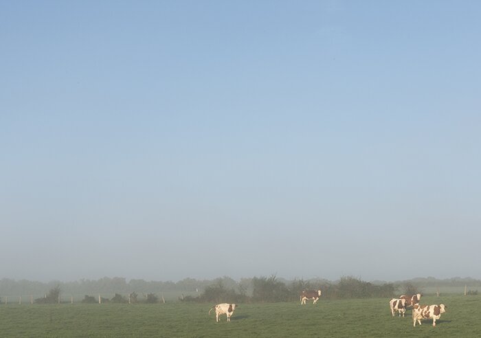 Een van dieren twijfelt over de te volgen route. Het staart me aan. De kop laag tussen de schouders. Het maakt geen geluid, rent niet op me af. Kijkt slechts. Dan rilt het even alsof we een vergelijkbare vrees voelen. ’s Avonds in de pastorie bij Annette voor het houtvuur, zien we hoe de maan hoog boven de koeien in het weiland het landschap verlicht. Even menen we een wolf te horen huilen.