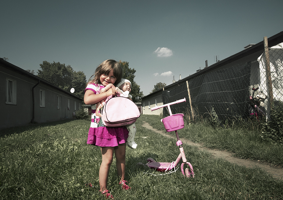 Even later rijden we een terrein op waar in rijen genummerde barakken staan opgesteld. Mosterdgeel omzomen ze een grasveld waarop een picknicktafel staat naast rijen waslijnen. We nemen plaats aan de houten tafel. Monica is samen met haar man Gregor een van de Roma die hier woont tussen een aantal Poolse families, voornamelijk moeders met kinderen.