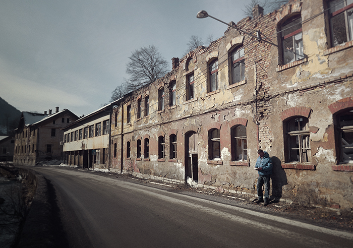 Inmiddels is de zon moeizaam boven de berg Bogoš uitgeklommen. Ze werpt licht op gevels waarvan het pleisterwerk al lang heeft losgelaten, de daken verdwenen zijn, evenals het glas in de ramen. Een bruggetje, een kilometer stroomafwaarts, verbindt ons met het fabrieksterrein.